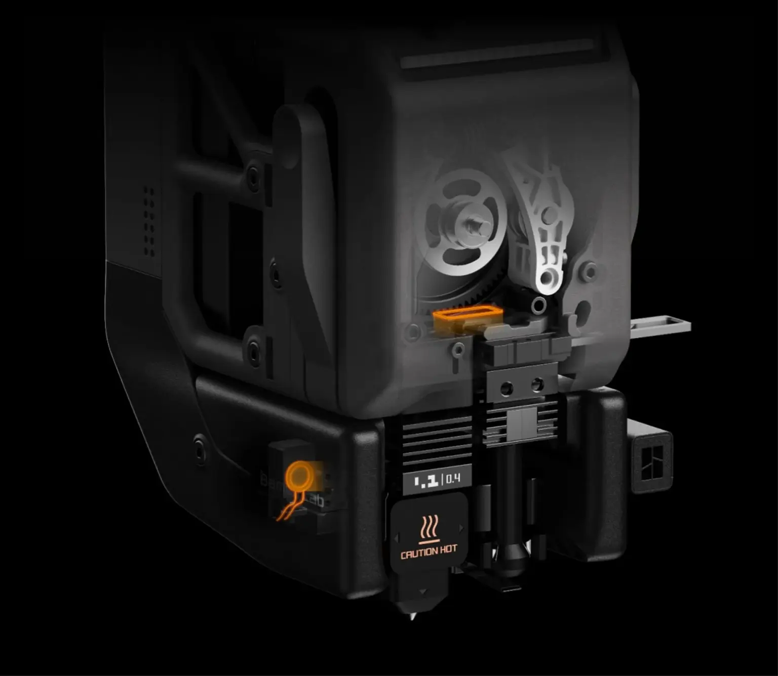 The H2C leverages both the servo motor on the extruder and the high-resolution eddy current sensors on the nozzle to sense extrusion dynamics. This enables precise extrusion control and automatic calibration of Pressure Advance (PA) parameters for each filament, resulting in smoother surfaces and cleaner, sharper edges.